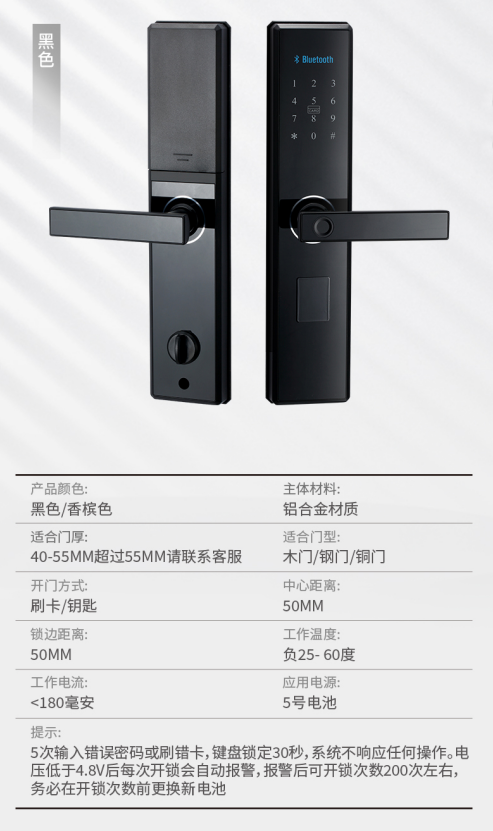 5次输入错误密码或刷错卡,键盘锁定30秒,系统不响应任何操作。电压低于4.8V后每次开锁会自动报警,报警后可开锁次数200次左右,务必在开锁次数前更换新电池